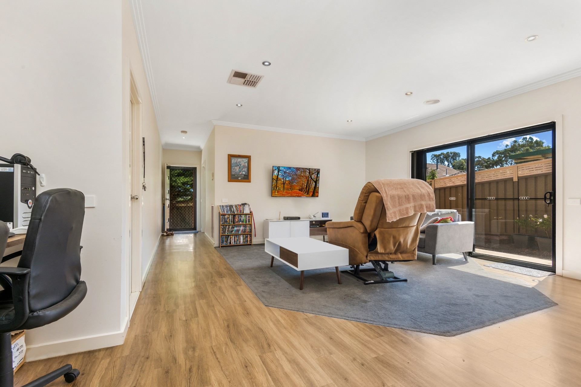 The open-plan living flows through to the outdoor area where you can sit and relax in the morning sunshine. Both participant bedrooms have built-in robes, plush carpet and share a modern bathroom with accessible features.